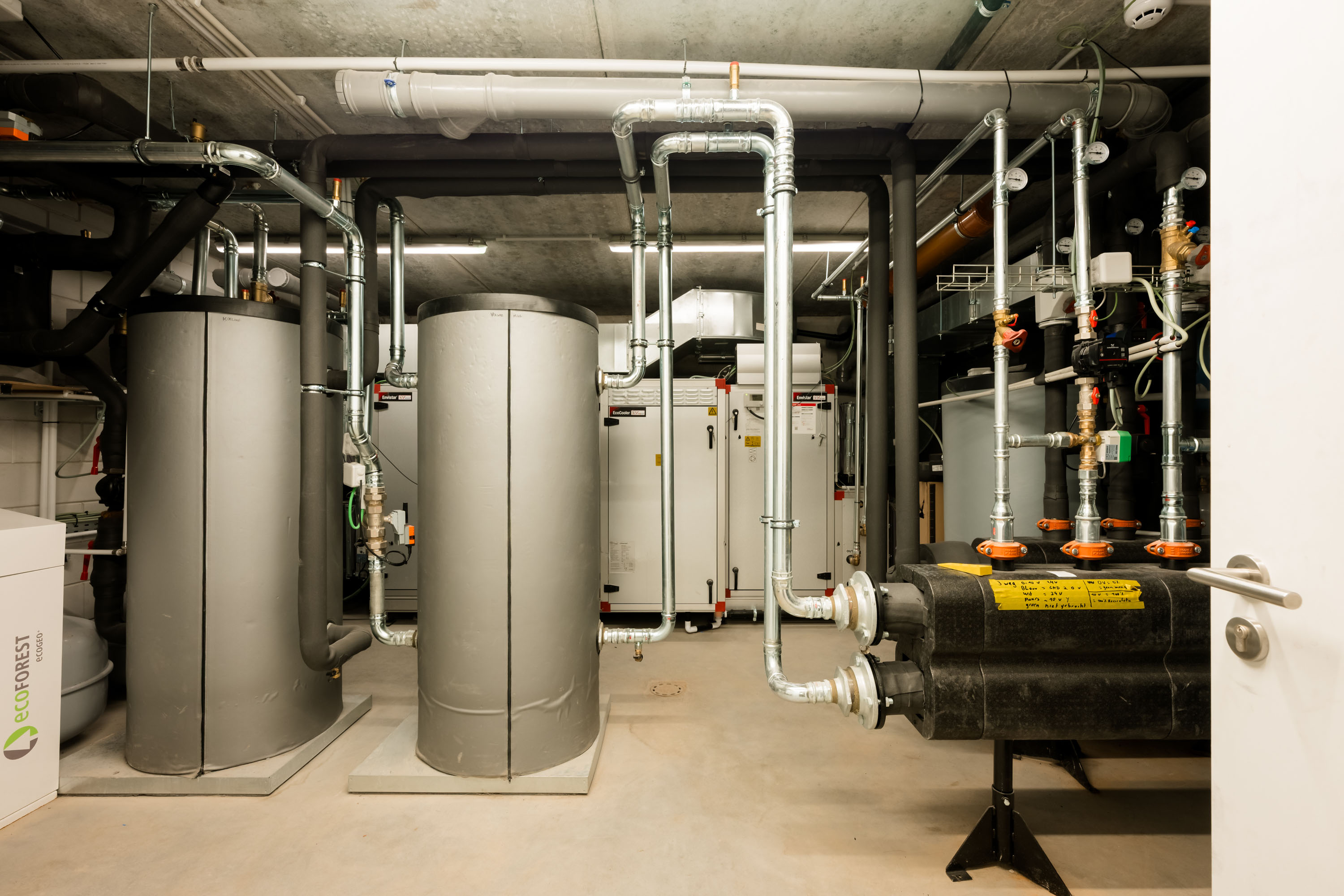 - Verschillende warmtepompen met een totaalvermogen van 60 kW. Voorzien van passieve koeling voor de appartementen en van actieve koeling voor de praktijken.